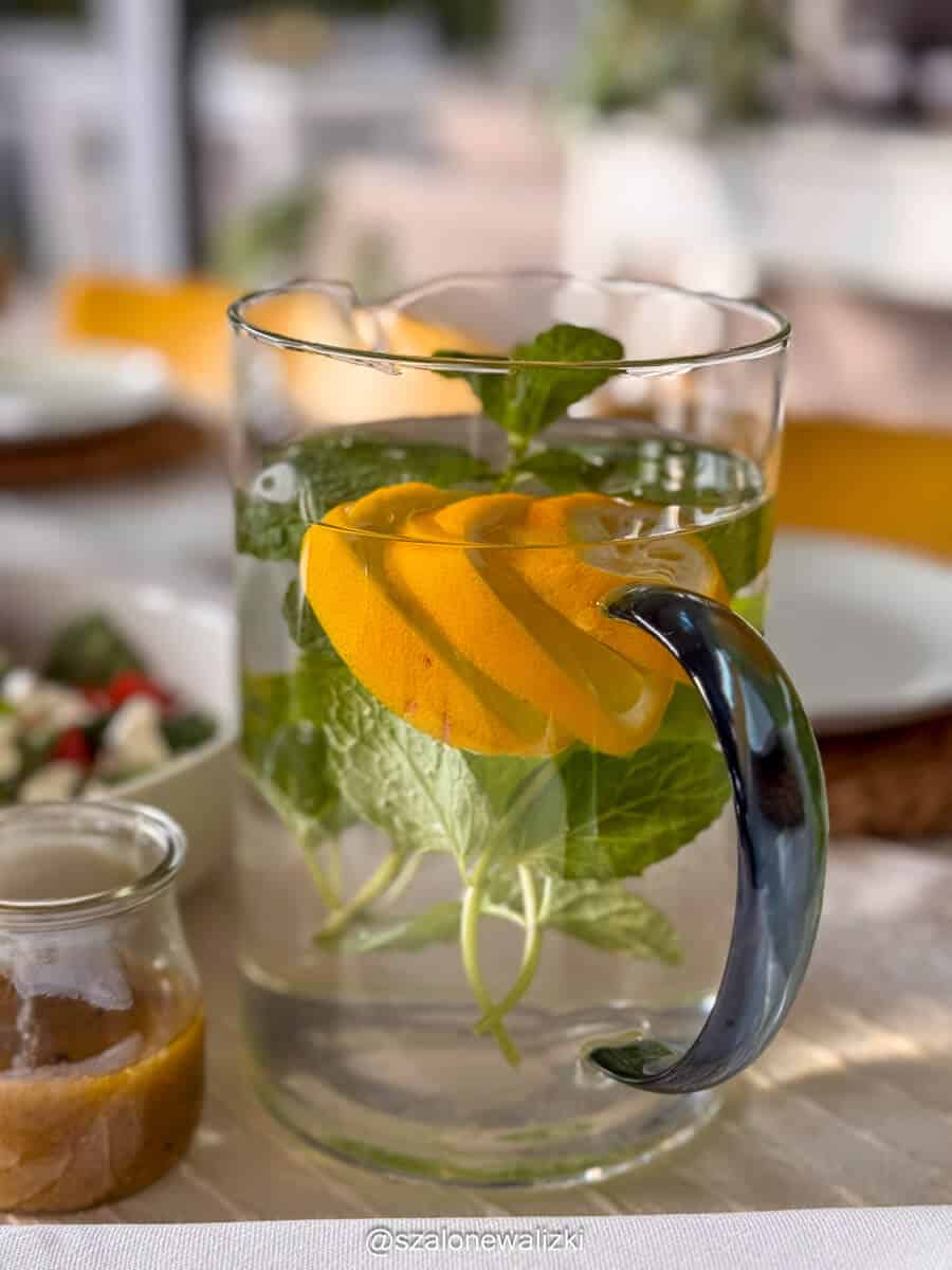 To najprostszy i jednocześnie przyjemny dodatek do zastawionego już stołu. Woda podana w prostym dzbanku z dodatkiem cytryny i mięty. My mamy dość prostą sprawę, bo mięta rośnie w naszym ogródku, ale można ją dziś bez problemu kupić w sklepach. Ludzie zapominają o nawodnieniu, a woda na stole przypomina się zawsze.