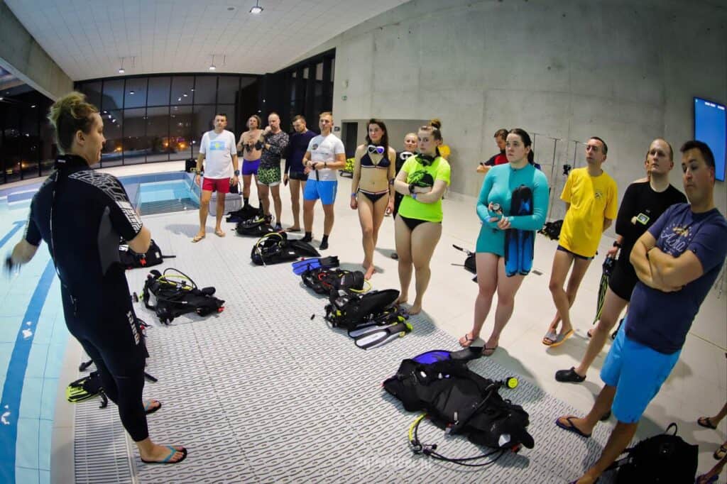 - Później przebieralnia i idziemy na basen, gdzie odbywa się odprawa i dobór sprzętu. Na basen zabieramy własne płetwy ( kaloszowe ), maskę, fajkę, można automat ale jak nie masz tego sprzętu wszystko znajdziesz na miejscu.