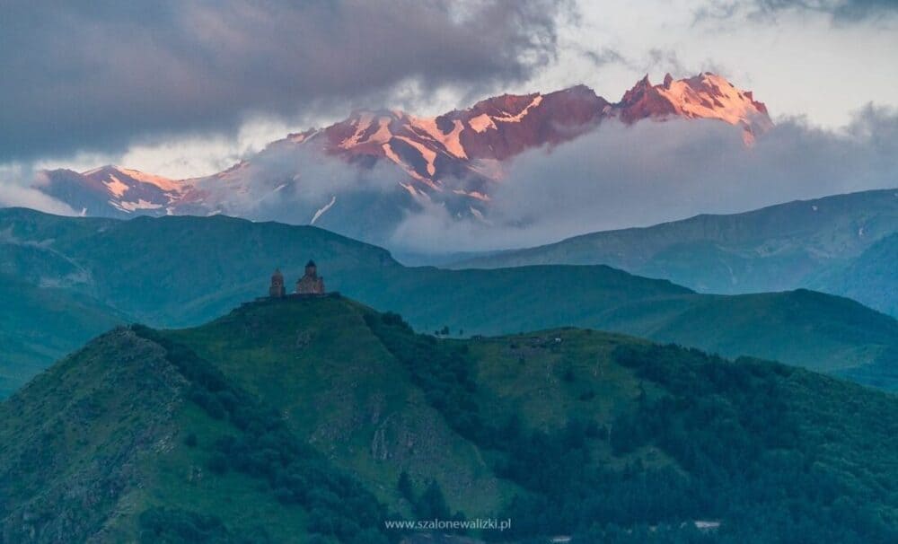 Jako, że nie wspinamy się na szczyty a jedyne co robimy to trekkingi, to postanowiliśmy połazić o poranku po okolicy by znaleźć dobre miejsce na wschód słońca i widok na górę. Takie miejsce znaleźliśmy nad miastem Stepancminda, skąd rozciągał się piękny widok na często wyłaniającą się właśnie rano spośród chmur górę.