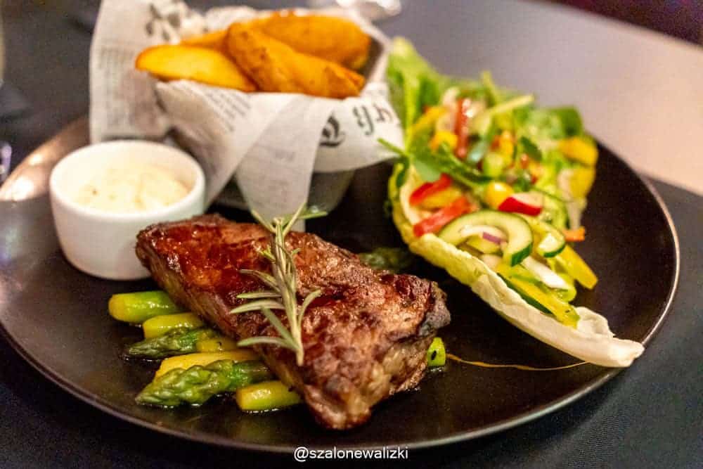 A później stek z biodrówki wołowej na szparagach, z chrupiącymi ziemniaczkami, świeżymi sałatami i klasycznym sosem pieprzowym. Dobry produkt, dobrze wysmażony, świetna sałata, wszystko w punkt.