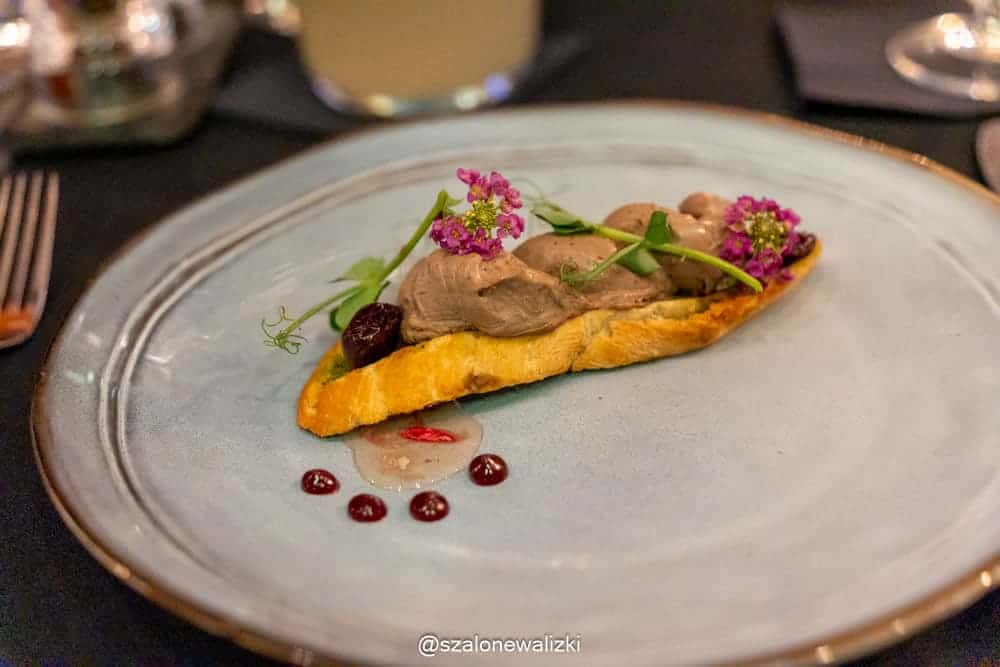 W Filmarze chcieliśmy też poznać ich pomysły na dania związane z historią Torunia i Piernikowym Szlakiem Kulinarnym. Szefem kuchni restauracji hotelu Filmar jest Łukasz Lofek, który stworzył w menu tzw. kartę kopernikańską, z której próbowaliśmy mus z wątróbki na grzance czosnkowej, puree wiśniowe i sok z czarnego bzu. Naprawdę świetna pozycja, świetna przystawka.