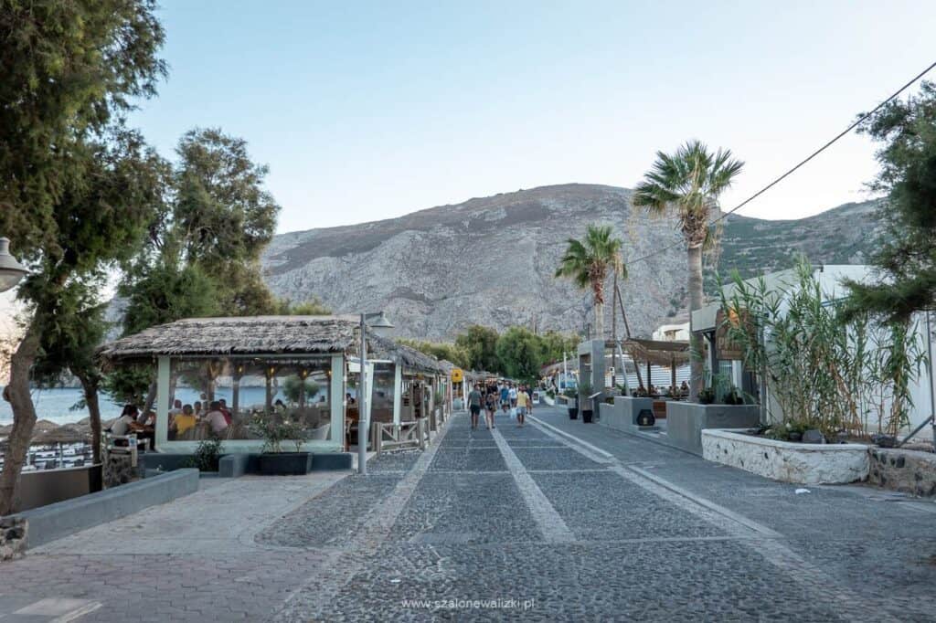 Nie ma tu urywających głowę widoków jak w Oia, chociaż położenie w cieniu drzew z widokiem na jedną z niewielu łagodnych, piaszczystych plaż na Santorini jest wystarczającą rekomendację.