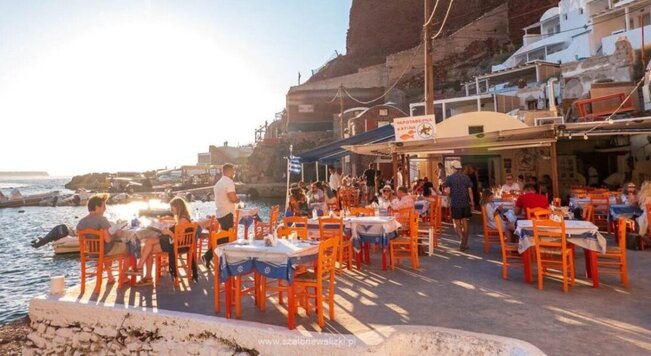 Na kolację w Oia możemy polecić rewelacyjną knajpkę u dołu klifu, która nazywa się Katina Fish Tavern. Serwuje niezapomniane ryby i ośmiornice.