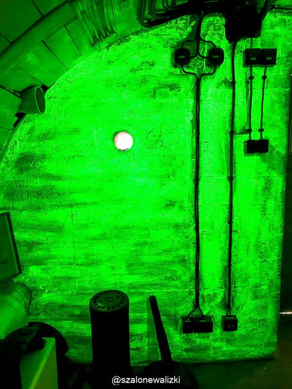 Co ciekawe, farba świeci do dziś czyli 80 lat po zakończeniu wojny, o czym mieliśmy okazję sami się przekonać. Przewodnik wyłączył światło, a naszym oczom ukazała się święcąca na zielono ściana.
