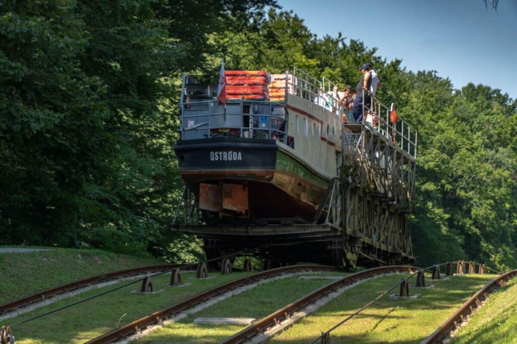 Także stąd ruszają stateczki, na tę niezwykłą atrakcję, gdzie można na żywo zobaczyć jedyne na świecie, wciąż funkcjonujące pochylnie.