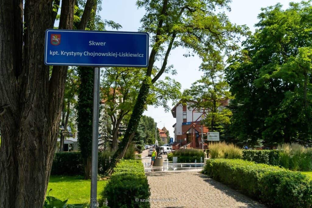 Obok ostródzkiego molo trafiliśmy na skwer kpt. Krystyny Chojnowskiej-Liskiewicz – wybitnej polskiej żeglarki, która jest honorową obywatelką Ostródy i która jako pierwsza kobieta samotnie opłynęła ziemię jachtem żaglowym.
